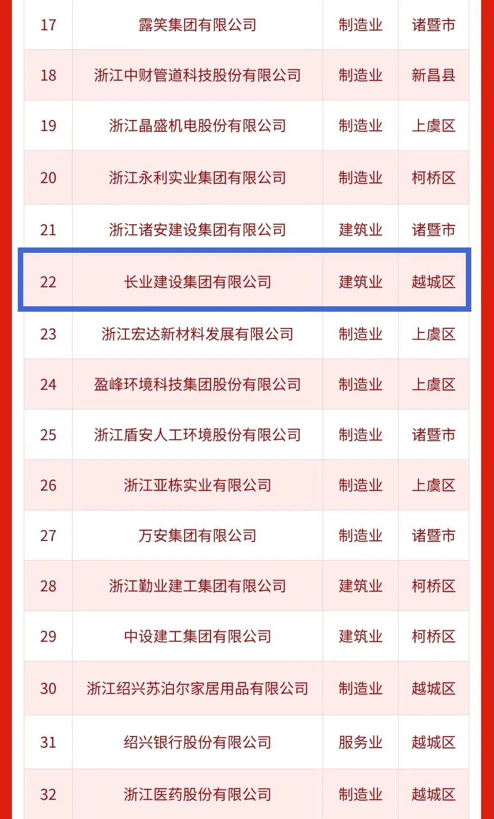 长业建设集团有限公司位列百强榜单第22位。